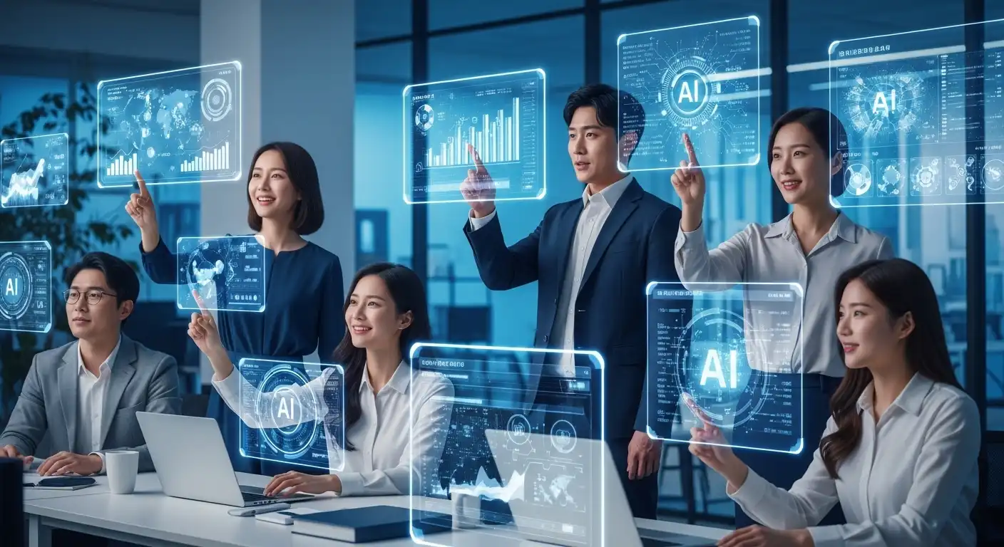 2025년 한국 AI 기술을 이끌어갈 혁신 기업의 전문가들이 미래 지향적인 사무실에서 협력하며 아이디어를 공유하는 모습